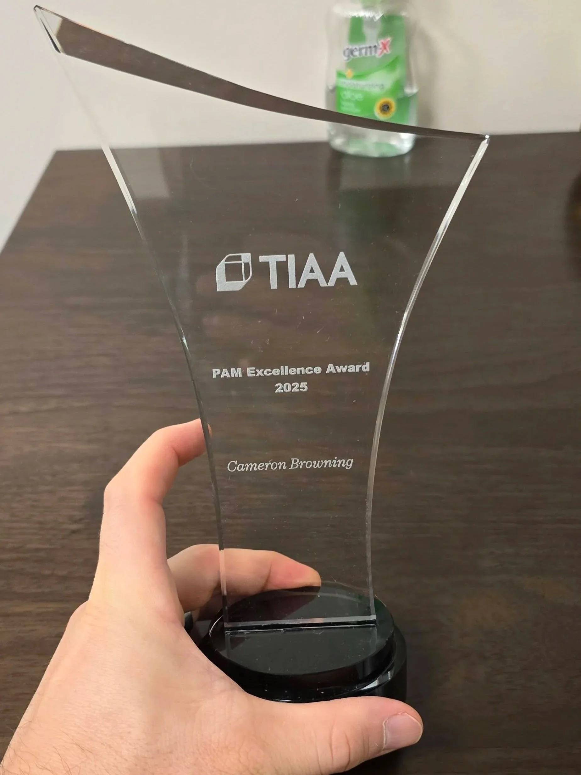 Cam earned a big promotion and won an award at the corporate level for his dedication to the company and his clients.