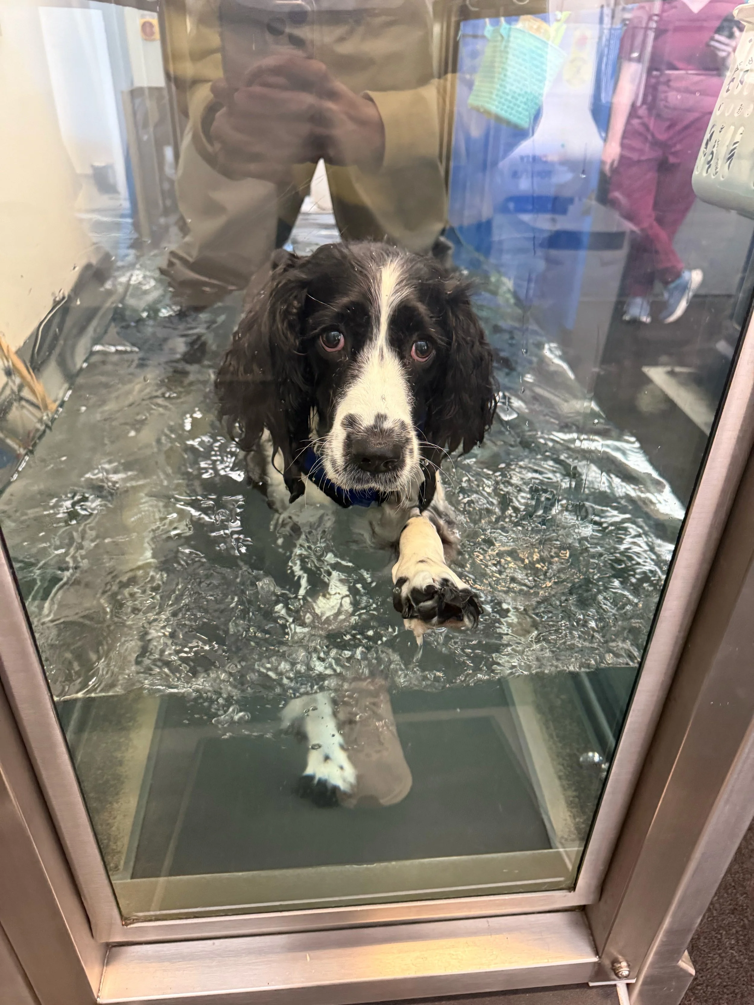 Don’t be fooled by the sad eyes - she gets an insane amount of cheese at every doggy physical therapy visit. This is her on the water treadmill.